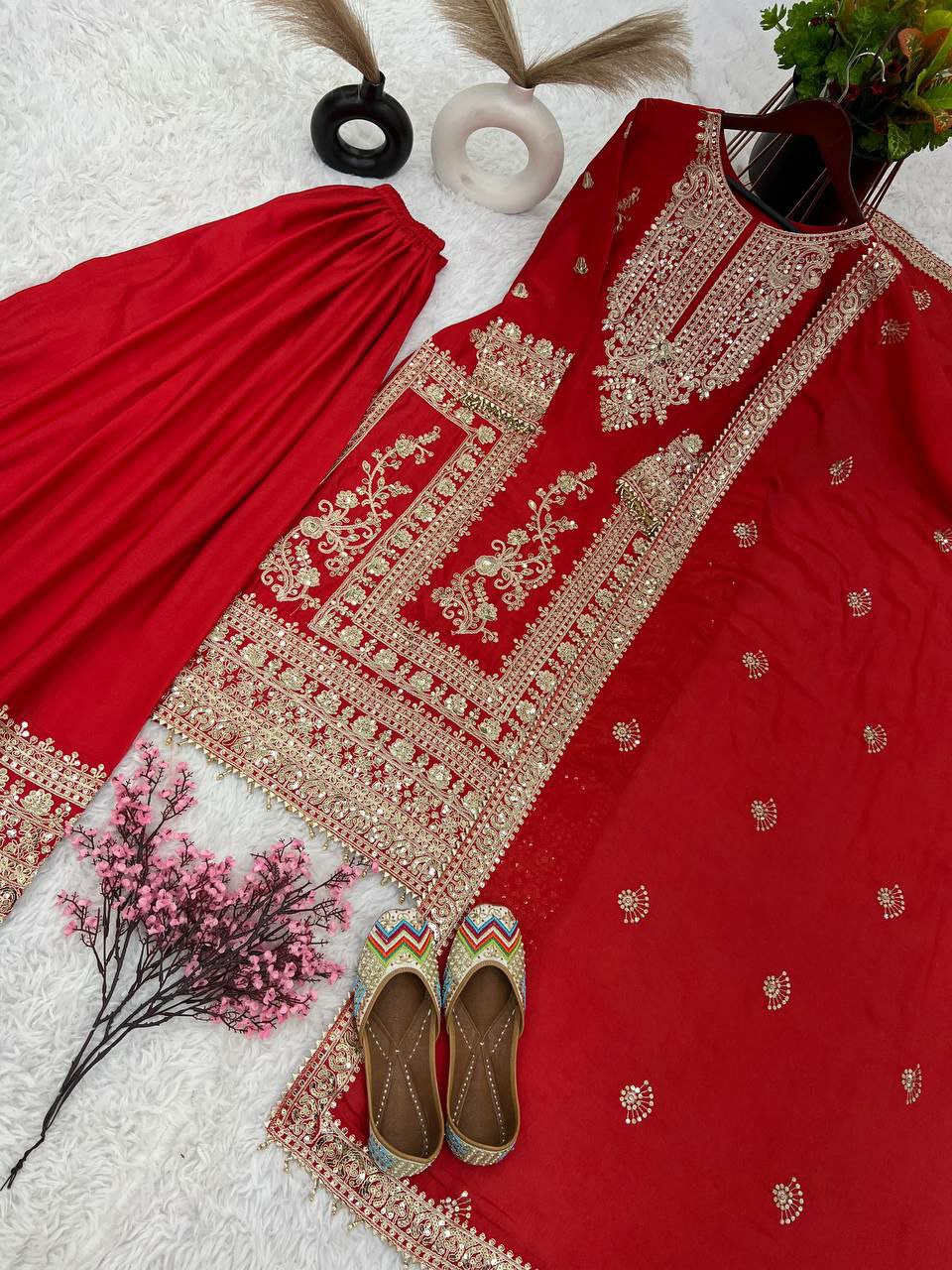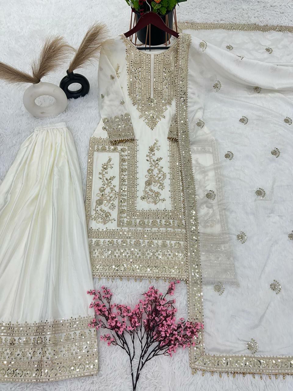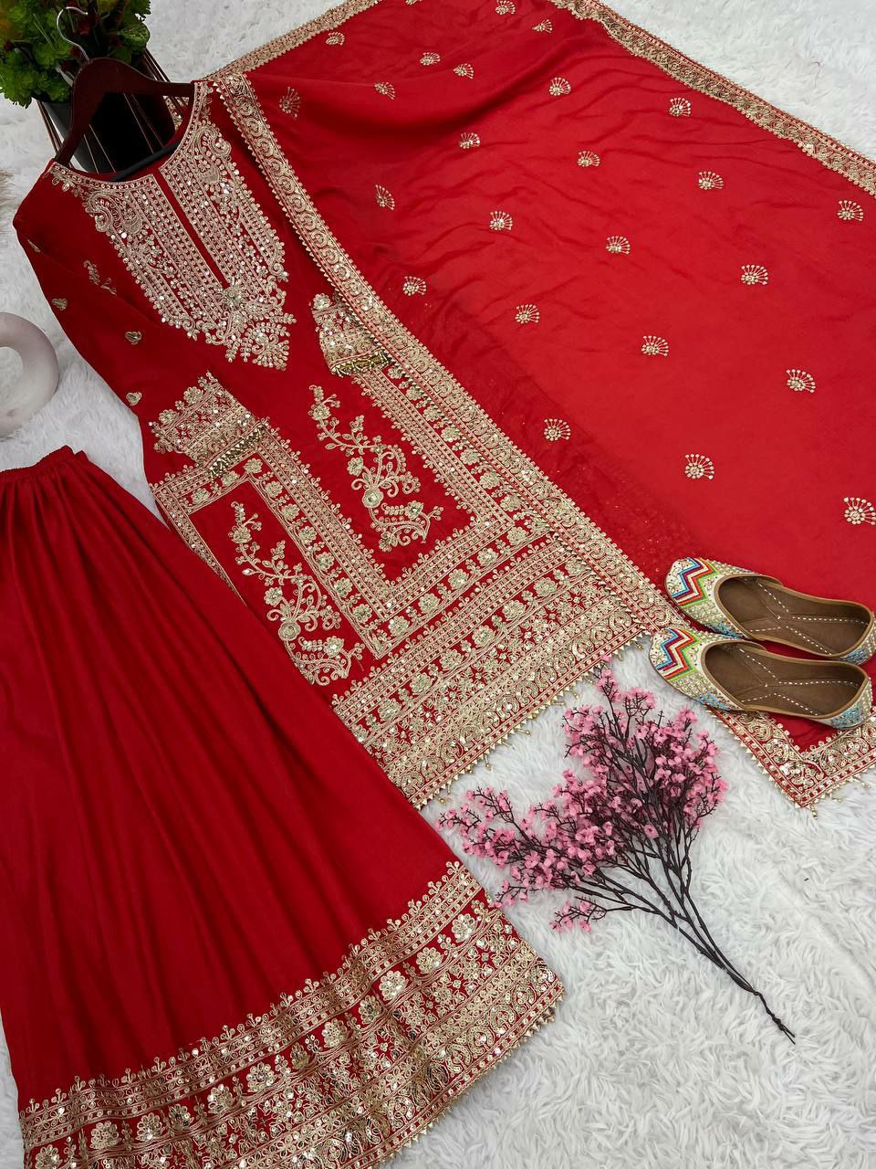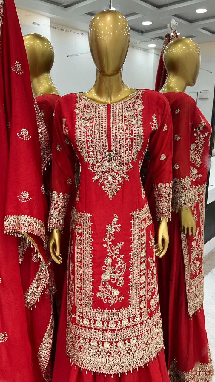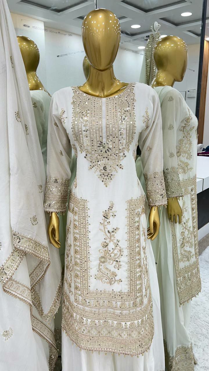 Fabric Detail Top Top Fabric : Pure Chinnon Silk With Heavy Embroidery Coding Dori-Sequence Work With Full Sleeve Kurtis Top Inner :Heavy Micro Cotton Top Length : 44-45 Inch Top Size : M(38),L(40), Xl(42), Xxl(44) (FULLY STITCHED READY TO WEAR) Plazzo Plazzo Fabrics :Pure Chinnon Silk With Heavy Embroidery Coding Dori-Sequence Work With Elastic (Full stitched) Plazzo Length :40-41 Inch (fully stitched) Dupatta Dupatta Fabric :Pure Chinnon Silk With Embroidery Coding Dori-Sequence Work With Lace Border