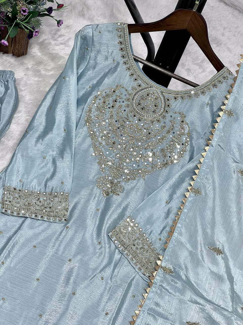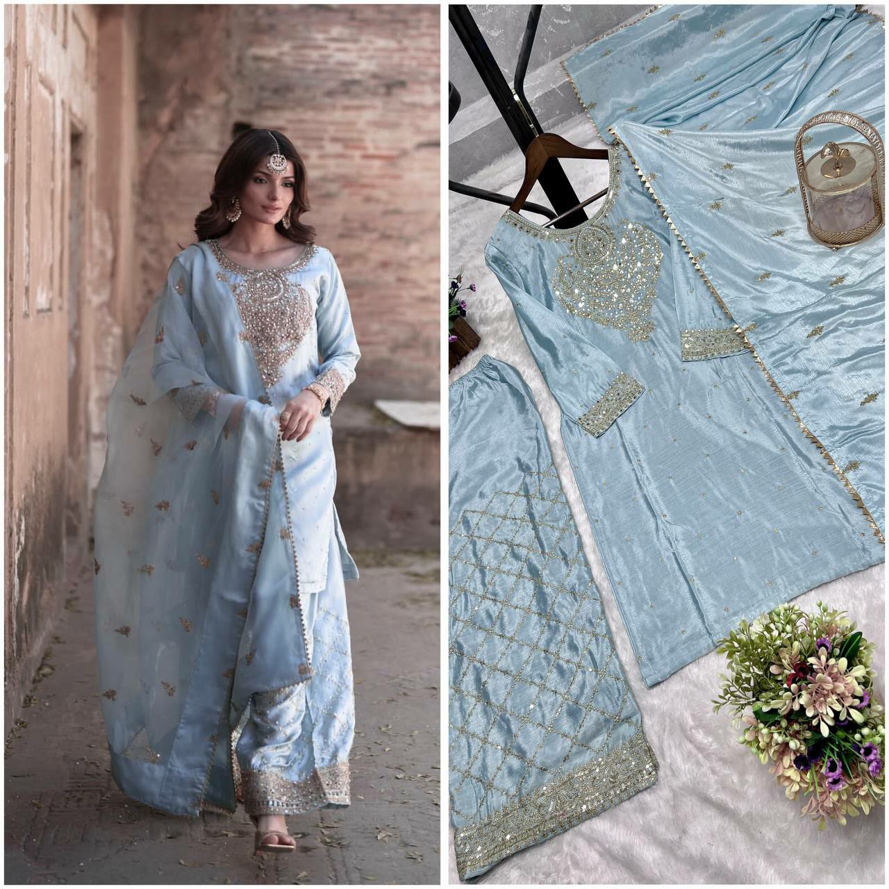 PURE CHINON SILK WITH ATTRACTIVE & BEUTYFUL EMBROIDERY SEQUENCE WORK AND READY MADE LACE BORDER KURTI PALAZZO DRESS