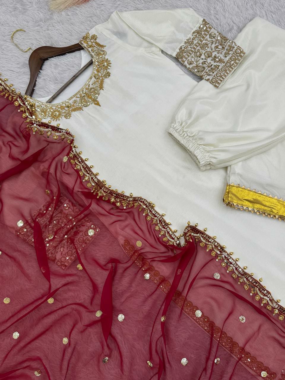 Pure Chinon Silk With Micro Cotton And Embroidery Sequins Work With Hanging Moti Lace Border Palazzo Kurti