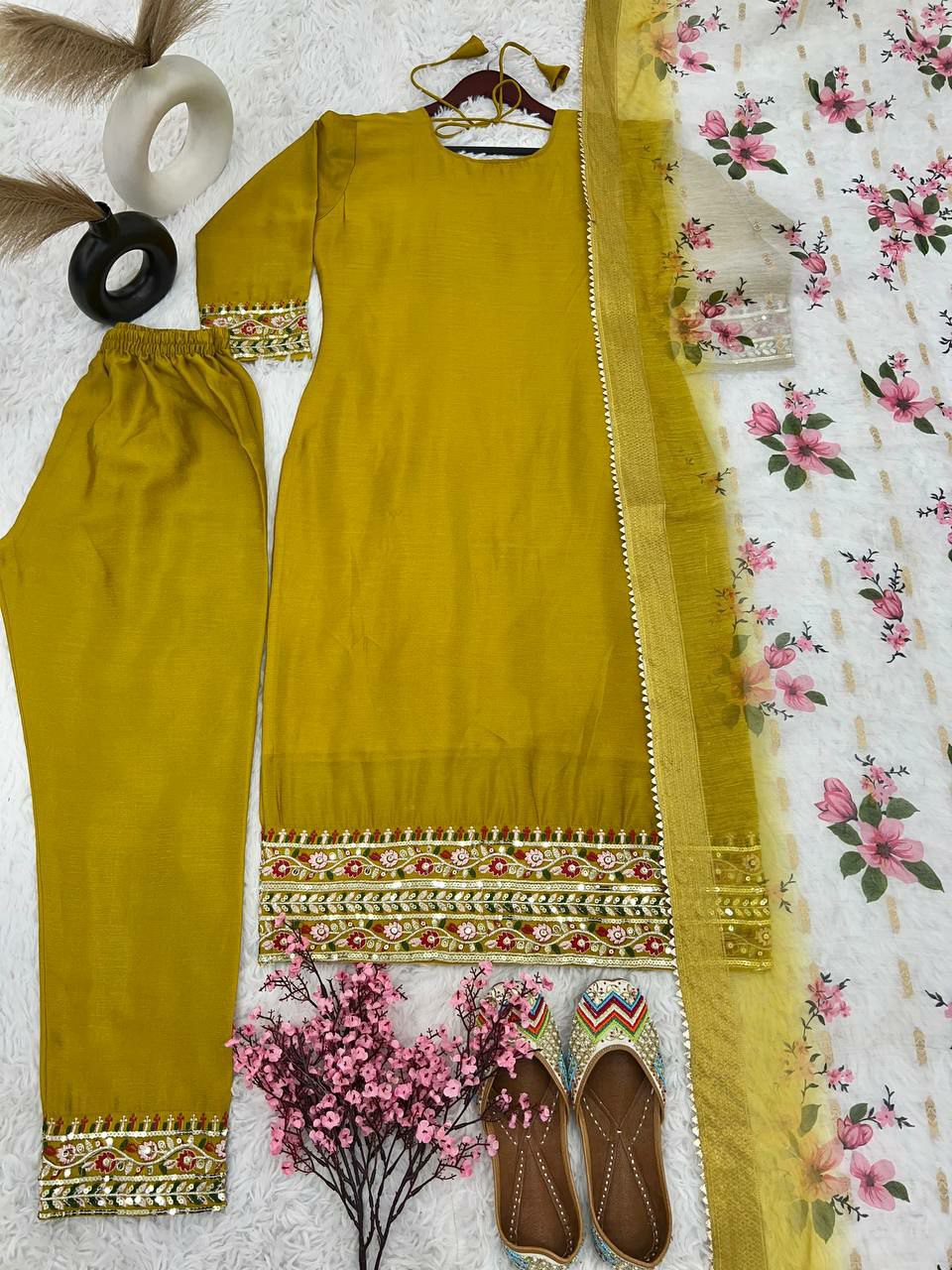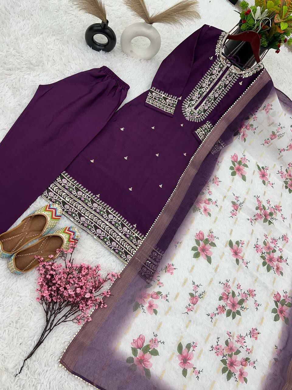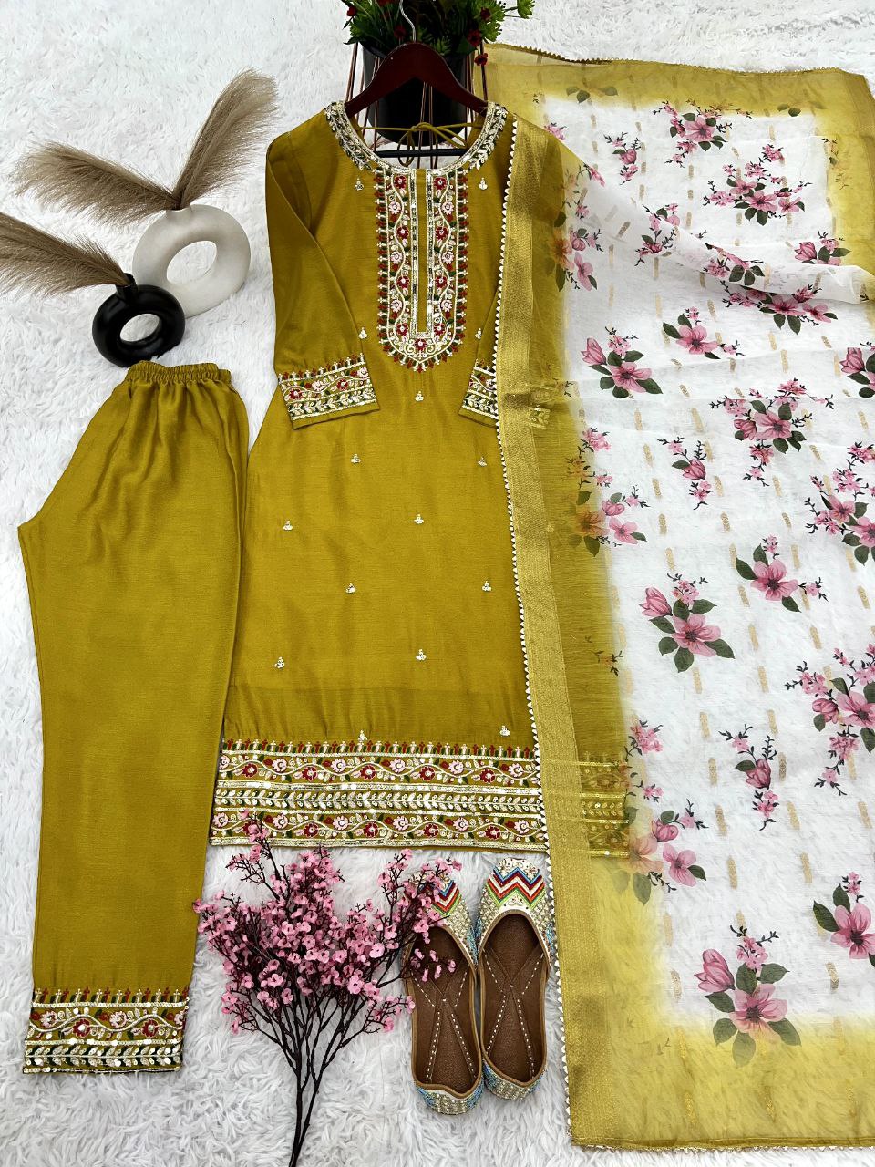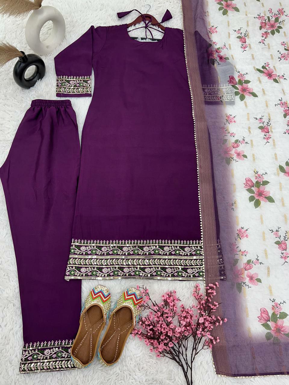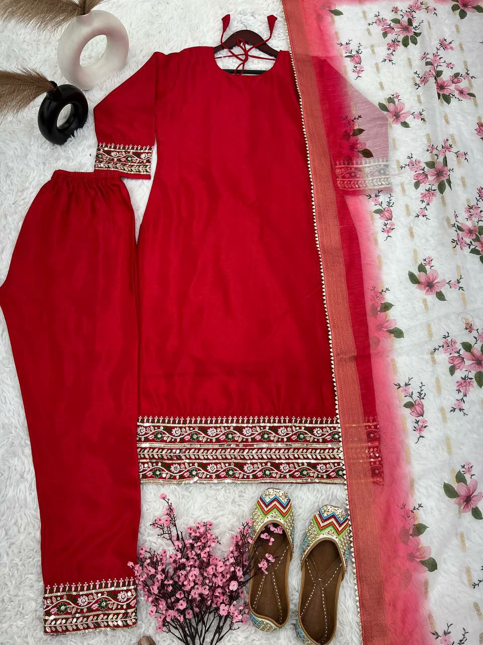 Fabric Detail Top Top Fabric : Pure Heavy Chinnon Silk With Heavy Embroidery Sequence Work Kurti Set With Full Sleeve Top Inner :Heavy Micro Cotton Top Length : 45-46 Inch Top Size : M(38),L(40), Xl(42), Xxl(44) (FULLY STITCHED READY TO WEAR) Plazzo Plazzo Fabrics :Pure Heavy Faux Chinnon Silk With Heavy Embroidery Sequence Work With Elastic (Full stitched) Palazzo Length :40-41 Inch (fully stitched) Dupatta Dupatta Fabric : Heavy Jacqard organiza Silk With Digital Print