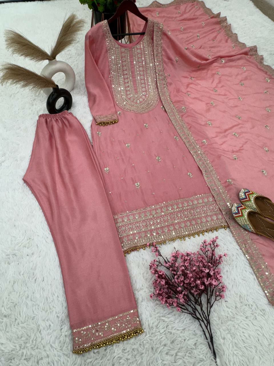 Pure Heavy Chinnon Silk With Heavy Embroidery Sequence Work With Full Sleeve Pink Kurti