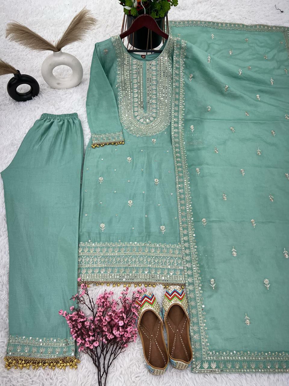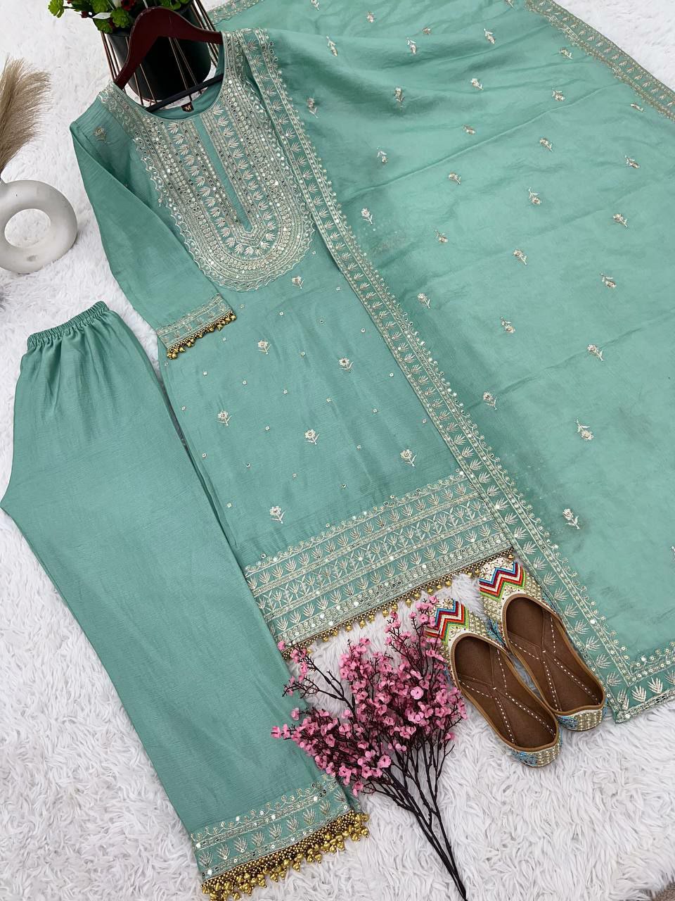 Fabric Detail Top Top Fabric :Pure Heavy Chinnon Silk With Heavy Embroidery Sequence Work With Full Sleeve With moti less Border Kurti Set Top Inner :Heavy Micro Cotton Top Length : 44-45 Inch Top Size : M(38),L(40), Xl(42), Xxl(44) (FULLY STITCHED READY TO WEAR) Plazzo Plazzo Fabrics : Pure Heavy Faux Chinnon Silk With Heavy Embroidery Sequence Work With Elastic (Full stitched) Plazzo Length :40-41 Inch (fully stitched) Dupatta Dupatta Fabric :Pure Heavy Faux Chinnon Silk With Embroidery Sequence Work With Lace Border