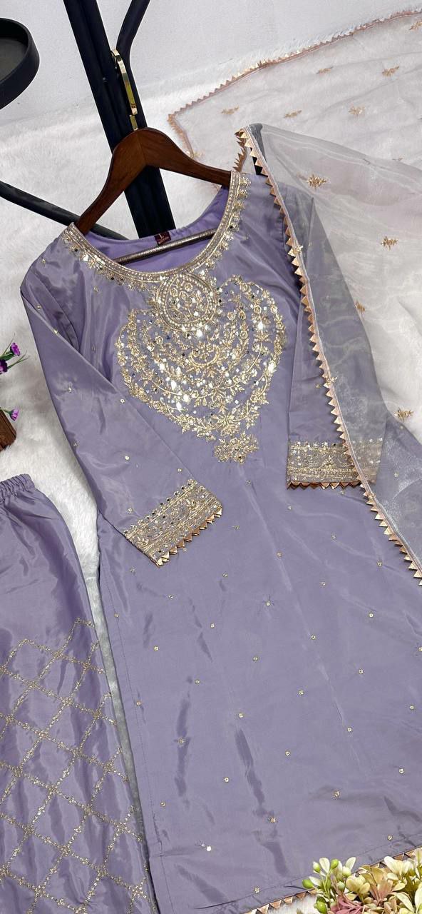 PURE NATURAL CREPE SILK WITH ATTRACTIVE EMBROIDERY SEQUENCE WORK AND READY MADE LACE BORDER PALAZZO KURTI