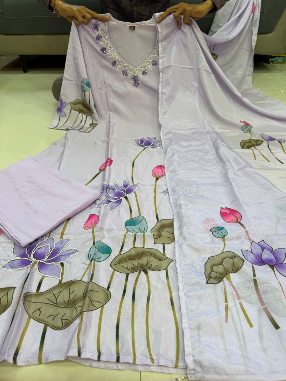 3-piece ready-made kurti set crafted from luxurious Premium Chinon fabric With Full Hand Work Nack Designed for festive and wedding occasions, this outfit blends tradition with modern charm.