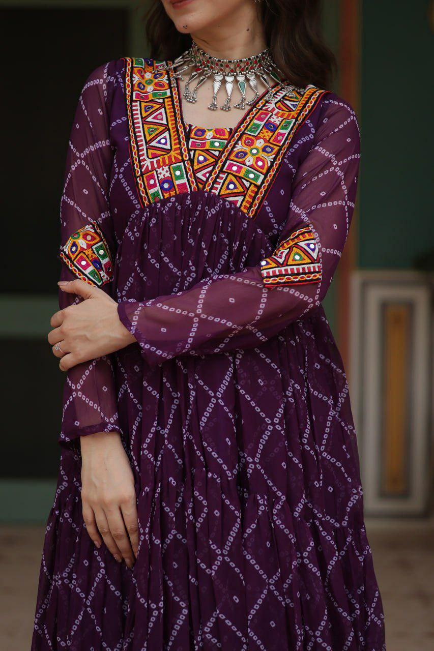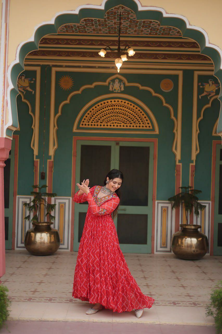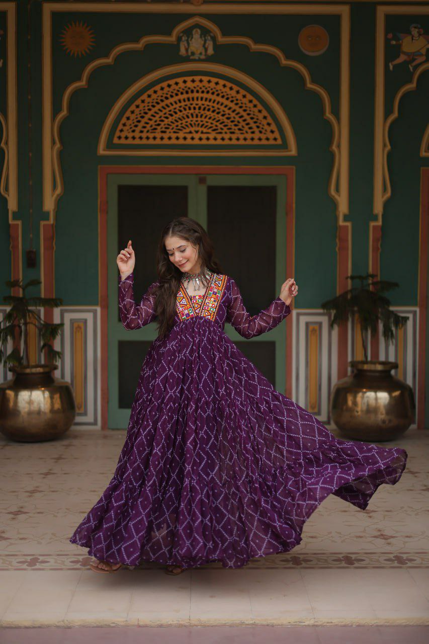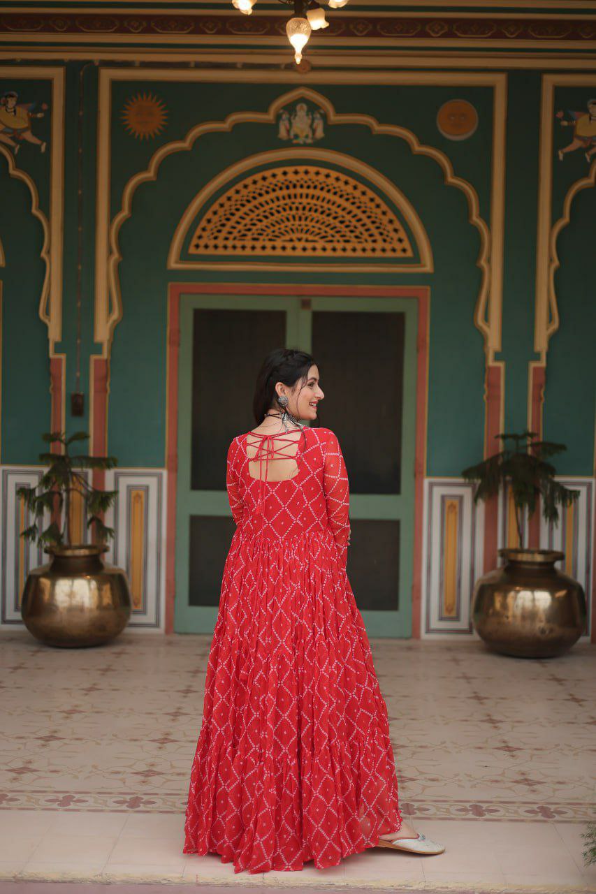 Bandhani Print work with kutchi patchework in Faux Georgette Gown