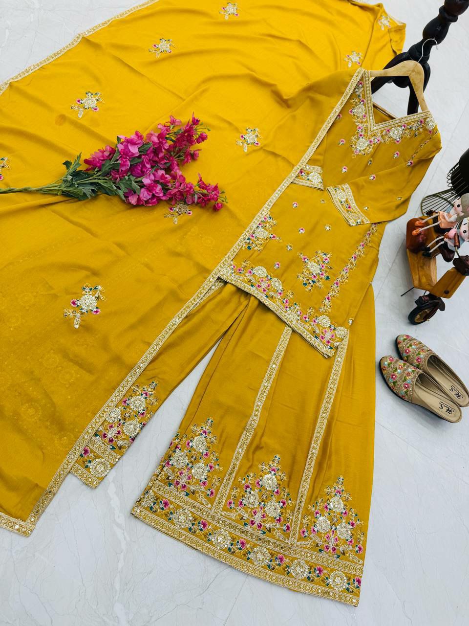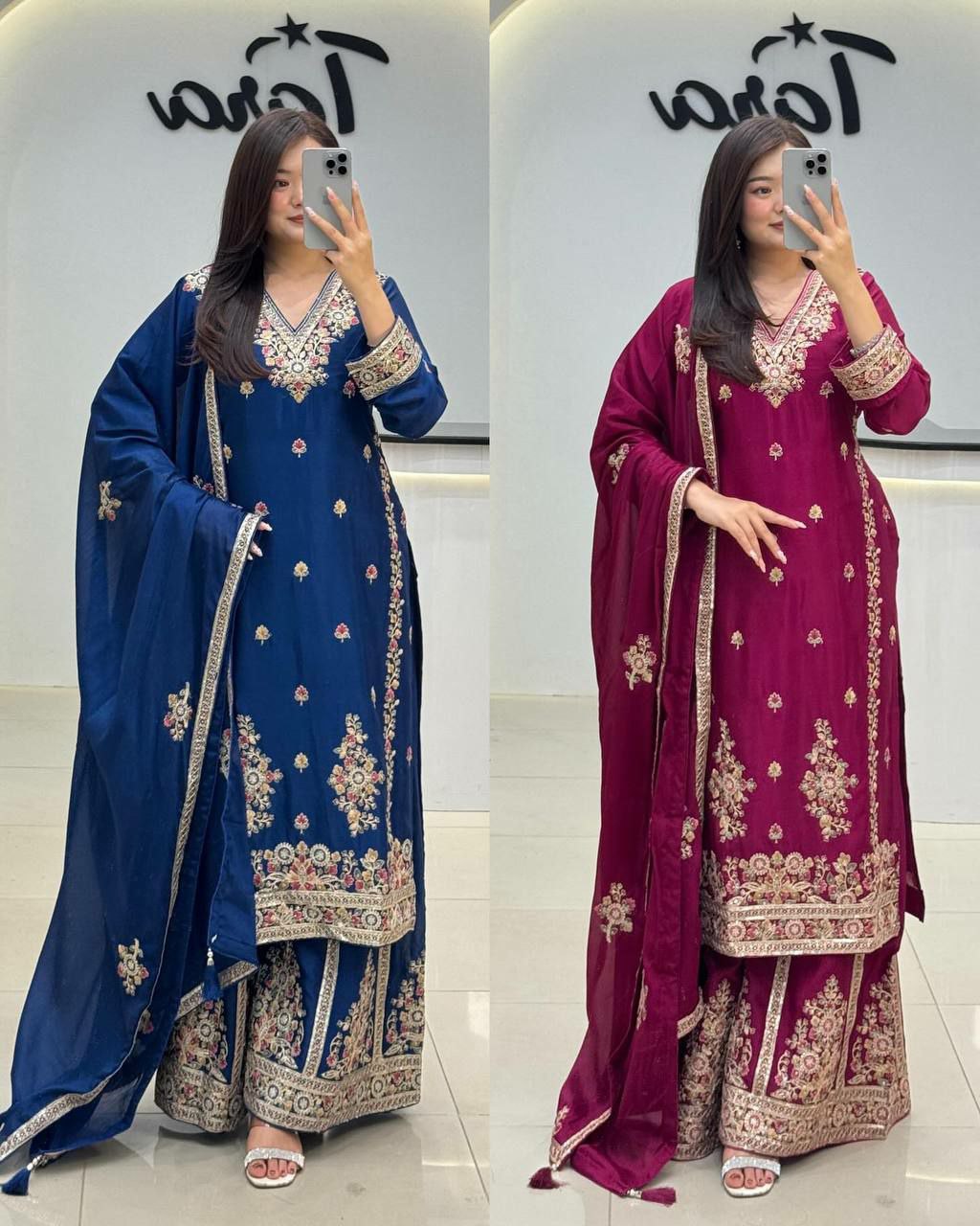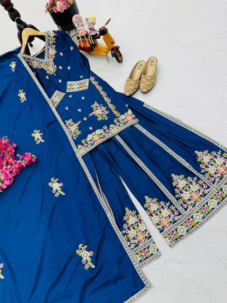 Chinon Silk With Round Neck And Codding Siquence Embroidery Work Sharara Dress
