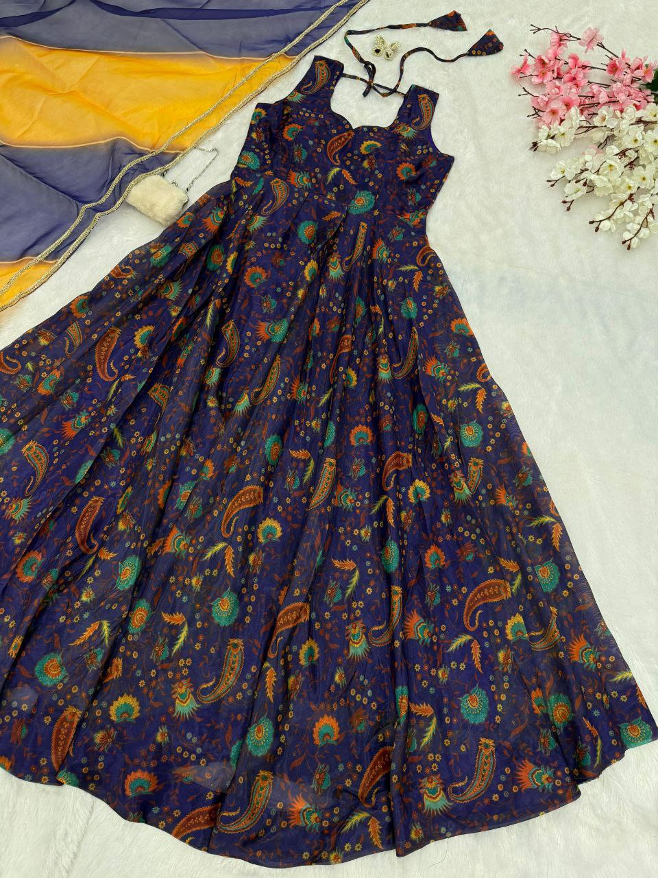 Digital Printed Jimmy Organza Silk Suit With Huge Flair And Organza Printed Dupatta With Lace Border Anarkali Gown