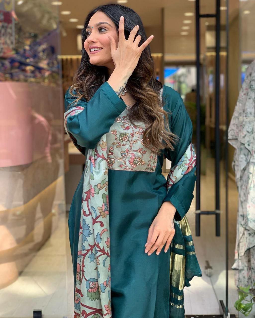 Featuring beautiful Heavy Suit Set which is beautifully decorated with intricate original print Nack, Zari weaving . It is paired with matching pants and print Dupatta.