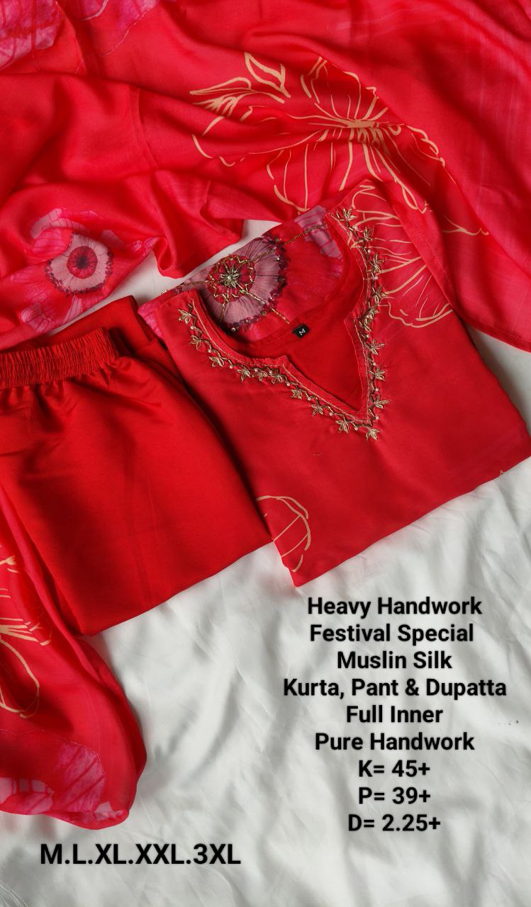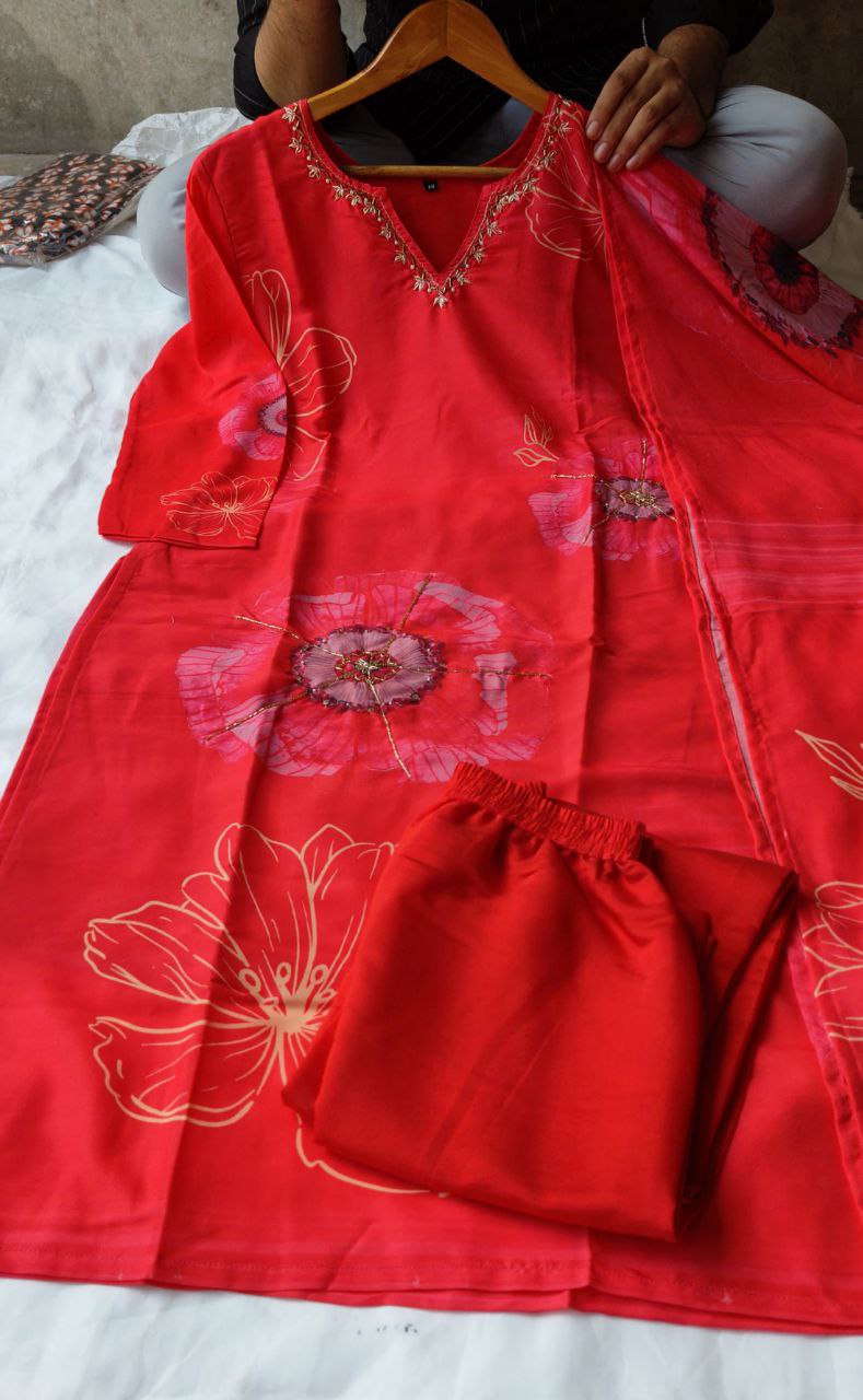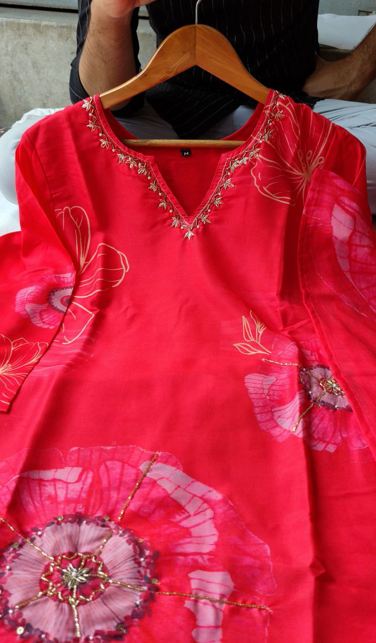 Heavy Handwork Detailing on Red Floral Printed Kurti