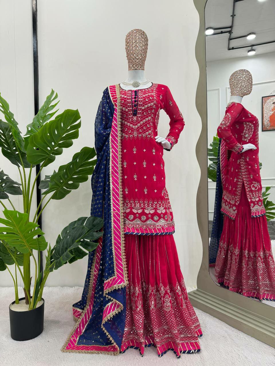 New Embroidery Faux Georgette Kurti And Sharara Set For Women For Wedding
