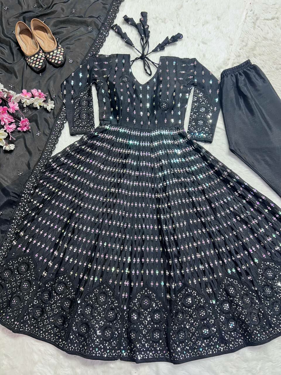 Pure Chinon Silk Material With 5mm And 9mm Sequence Embroidery Work With Fancy Full Sleeves & Kali Cut Pattern Anarkali