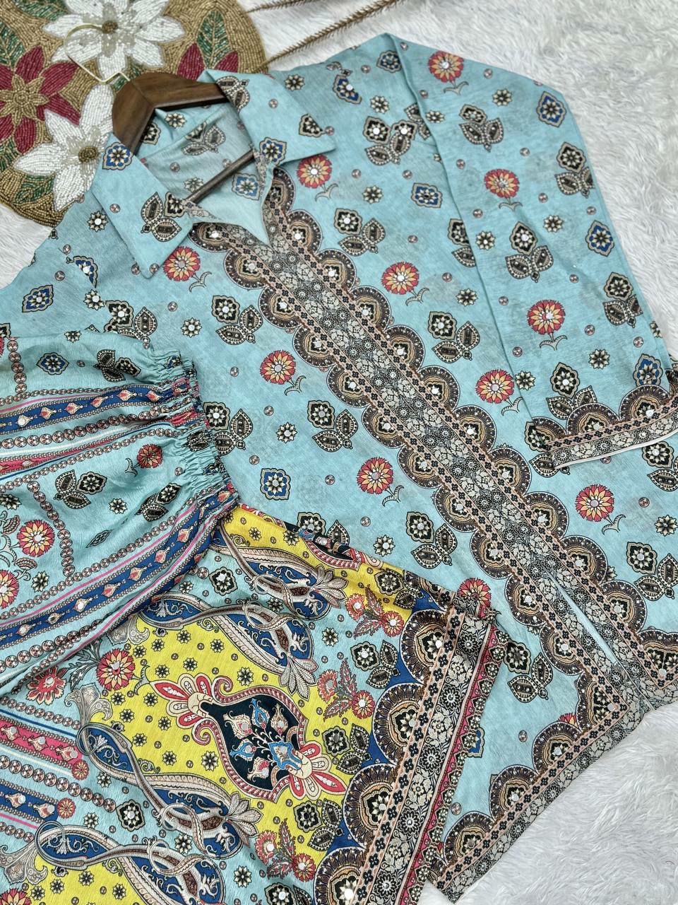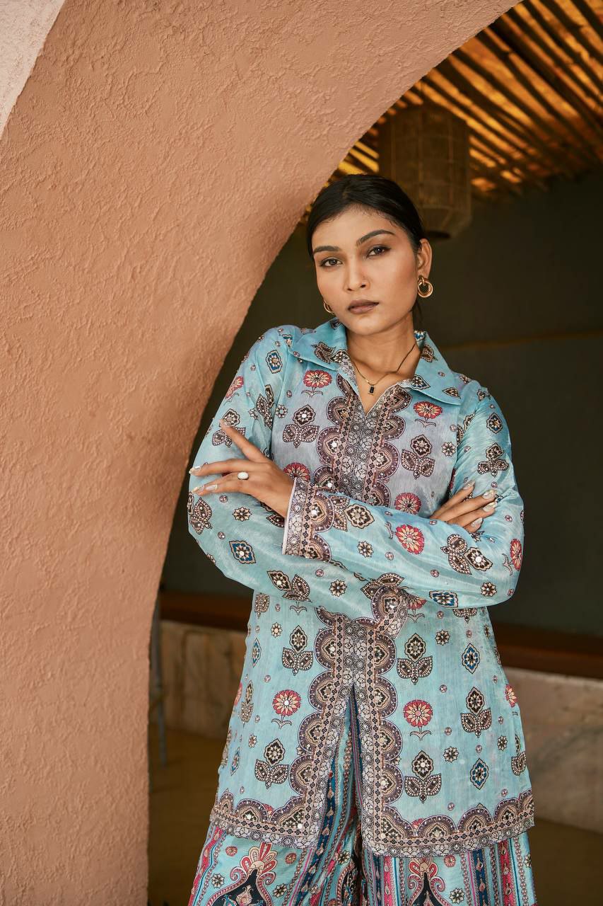 Pure Chinon Silk With Digital Print & Real Mirror With Stone Hand Work With Elastic Palazzo Dress
