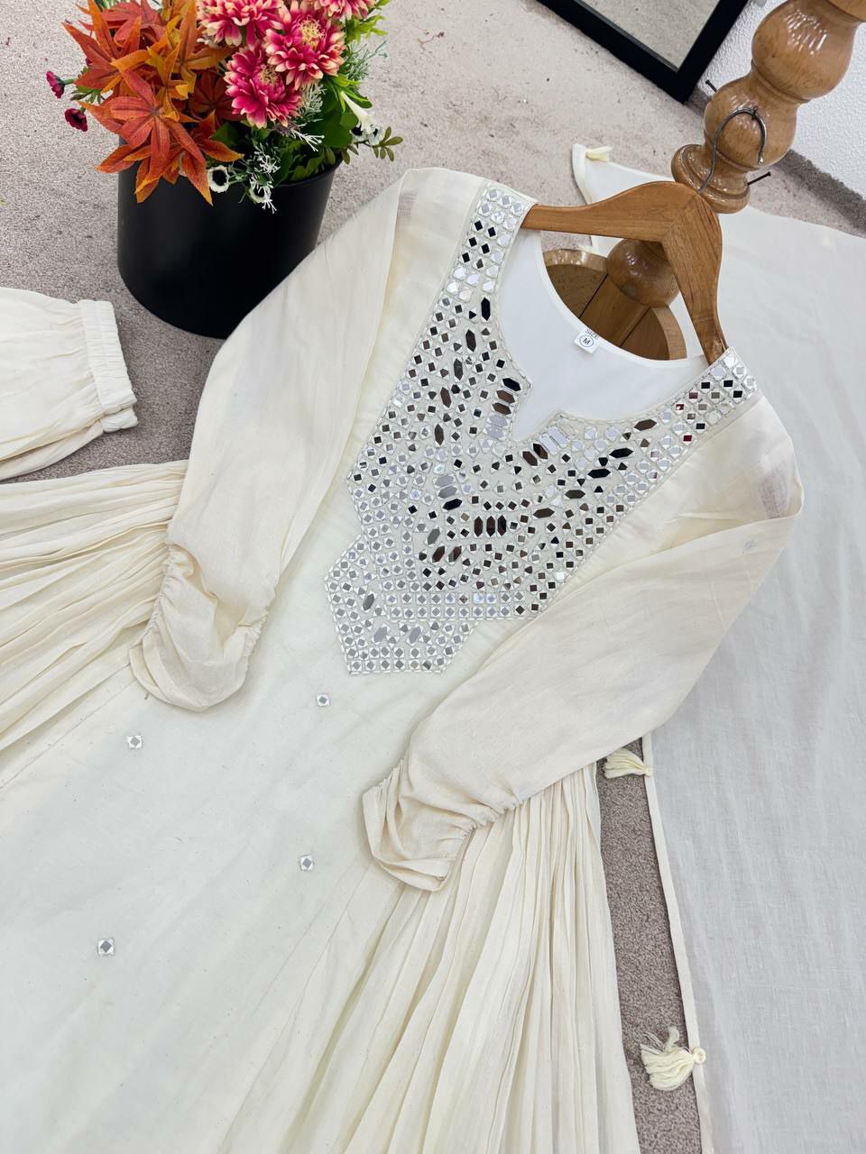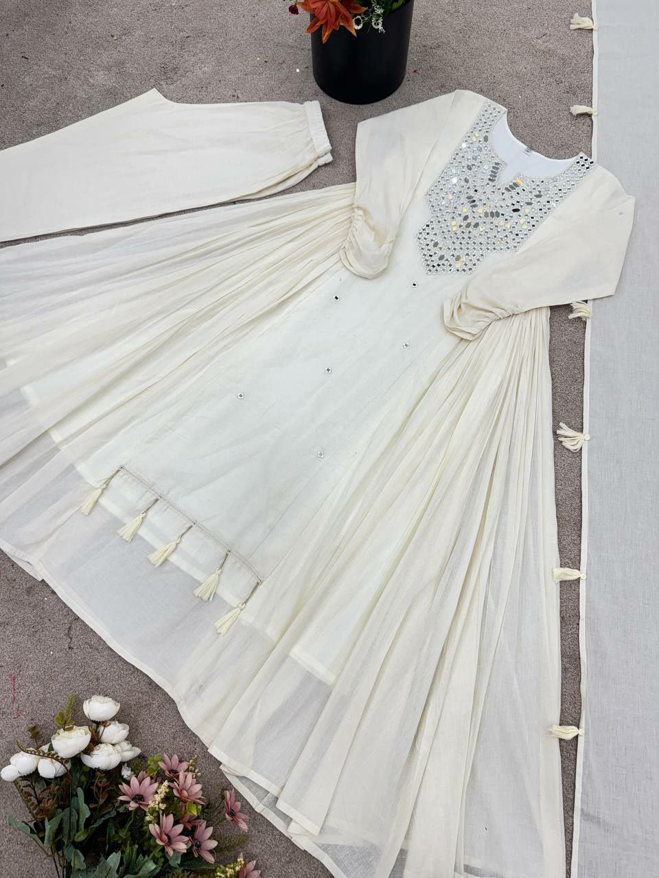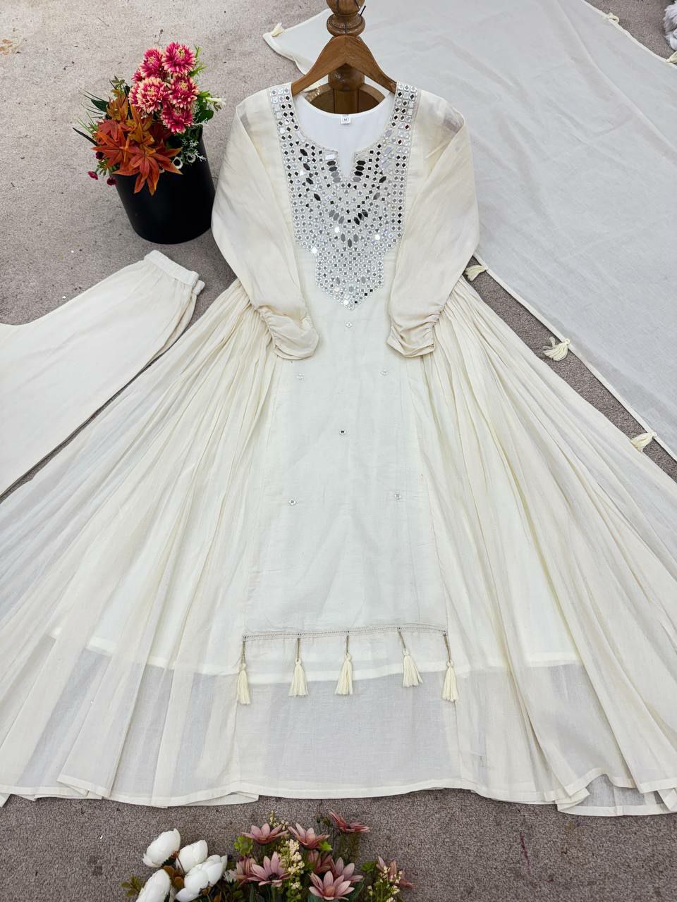Pure Khadi Cotton With Khatli Work And Real Mirror With Dupatta Type Gown