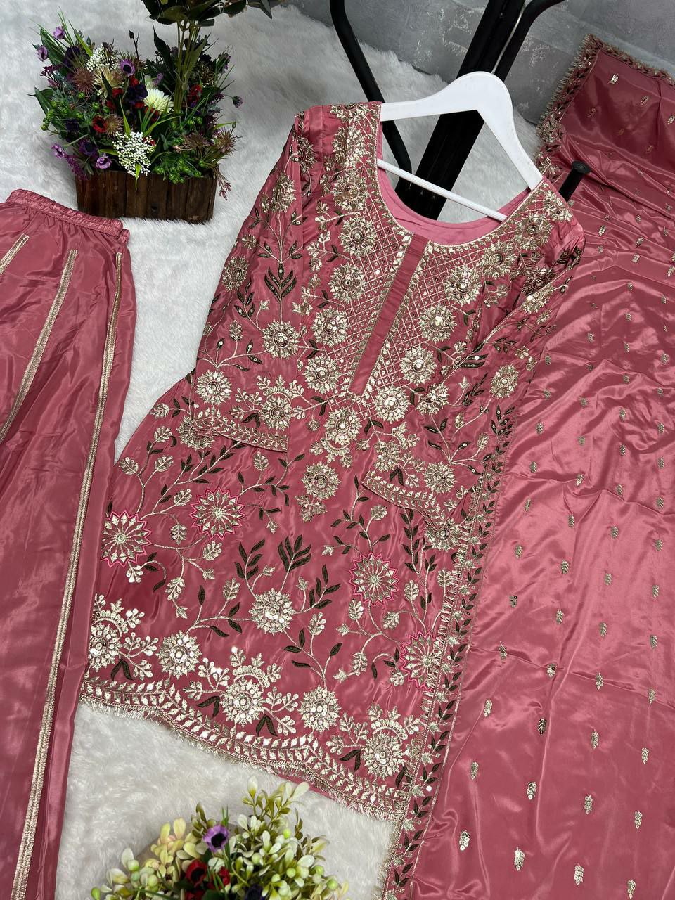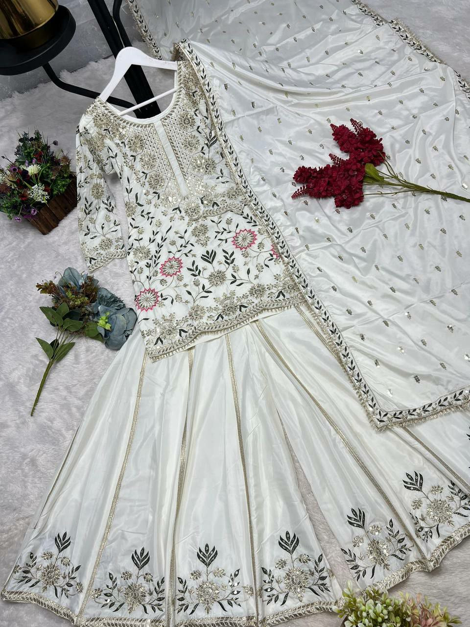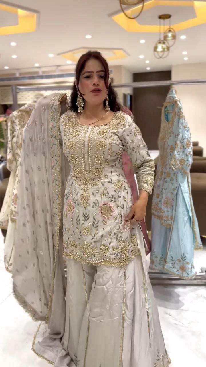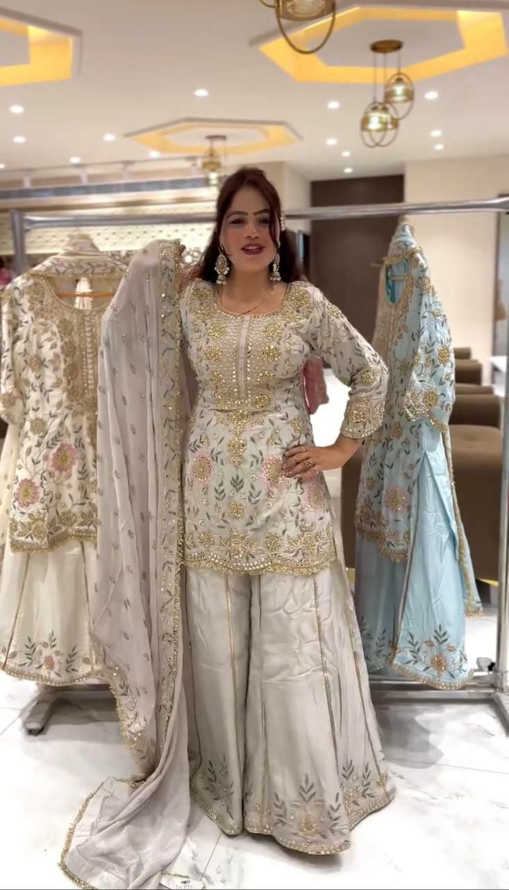 Pure Natural Crepe Silk With Fancy & Beautiful Embroidery And Sequence Work With Fancy Ready Made Lace Border Palazzo Dress