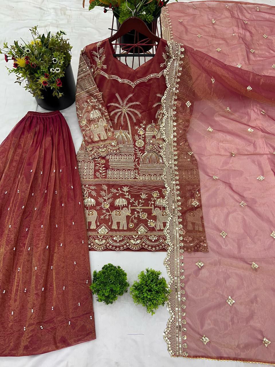 Twill Net With Beads Work With Elastic And Embroidery Sequence Work With Lace Border Top & Palazzo