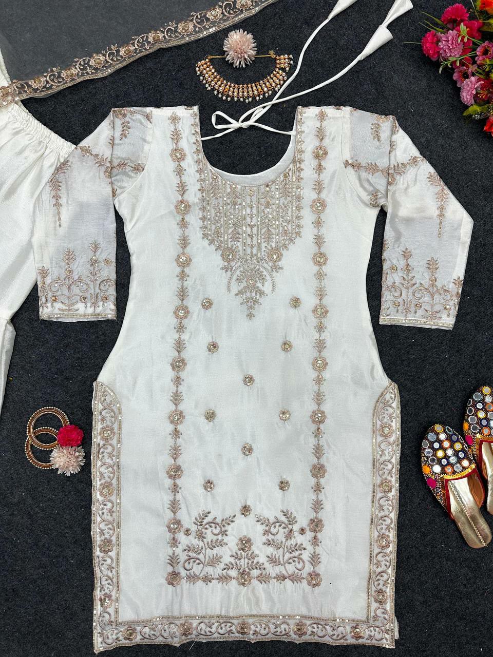 White Chinon Silk Sequence Work For Women For Wedding